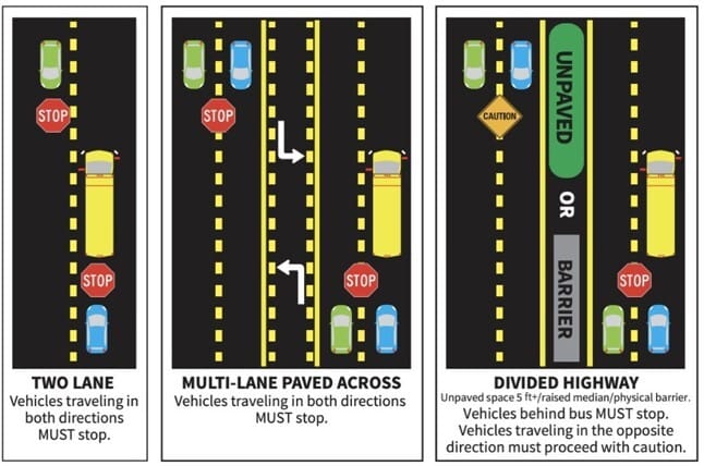 You MUST stop when approaching a school bus with its stop arm extended and lights flashing, whether you’re behind it or coming from the opposite direction.